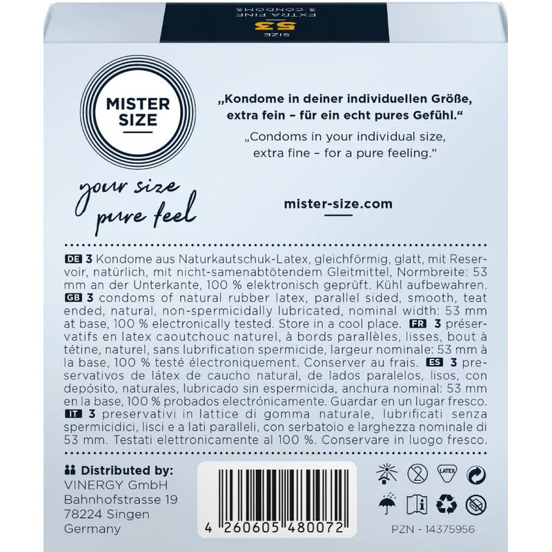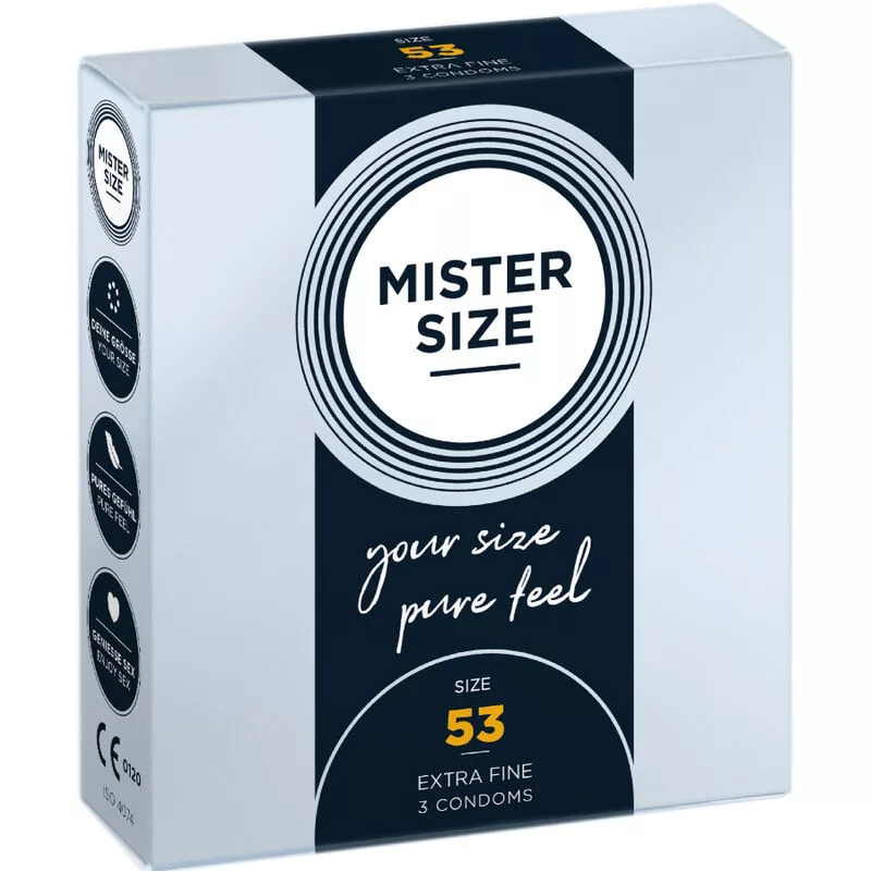 Fedezd fel a MISTER SIZE 53 varázsát, és élvezd a szexuális kapcsolatok új dimenzióját! Az igazi kényelem és a hihetetlen érzéki élmények egyesítése érdekében tervezett kondomunk minden egyes pillanatot felejthetetlenné varázsol – akárhol is tartózkodsz!