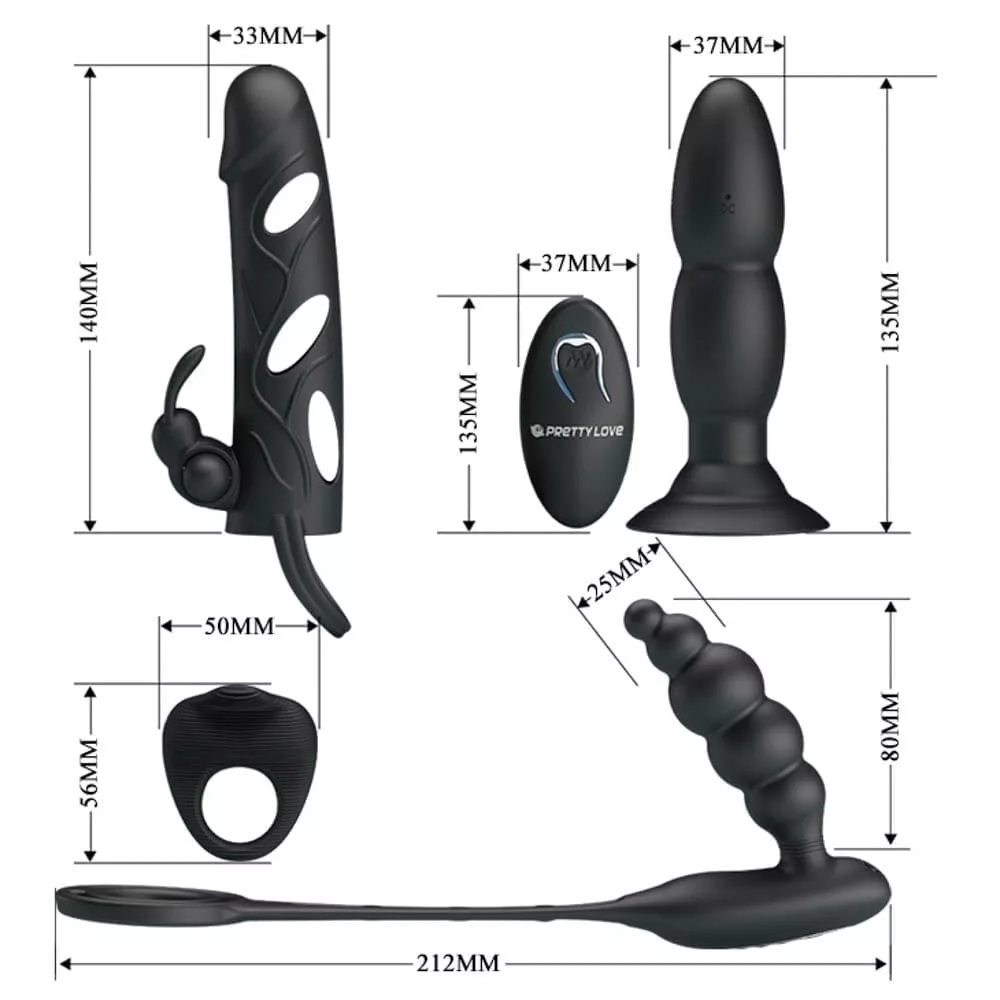 Tartalma : egy 13,5 cm hosszú, 3,7 cm átmérőjű, vezeték nélküli távrányítóval is szabályozható, 4 rezgési és 4 forgási funkcióval rendelkező fenékdugó, egy állítható rezgéserősségű, 14 cm hosszú, 3,3 cm átmérőjű, csiklóizgatóval kiegészített péniszköpeny, egy állítható rezgéserősségű, 5,6 cm hosszú, 5 cm átmérőjű péniszgyűrű és egy péniszgyűrűvel kiegészített, 21,2 cm hosszú (behelyezhető hossz 8,8 cm), 2,5 cm átmérőjű, vibrátoros prosztata masszírozó.