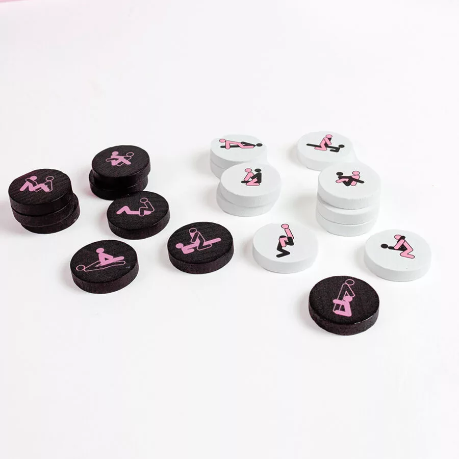 • 42 db játékre készen álló darab: 21 fehér és 21 fekete, mindegyik egyedi Kama Sutra pozícióval.