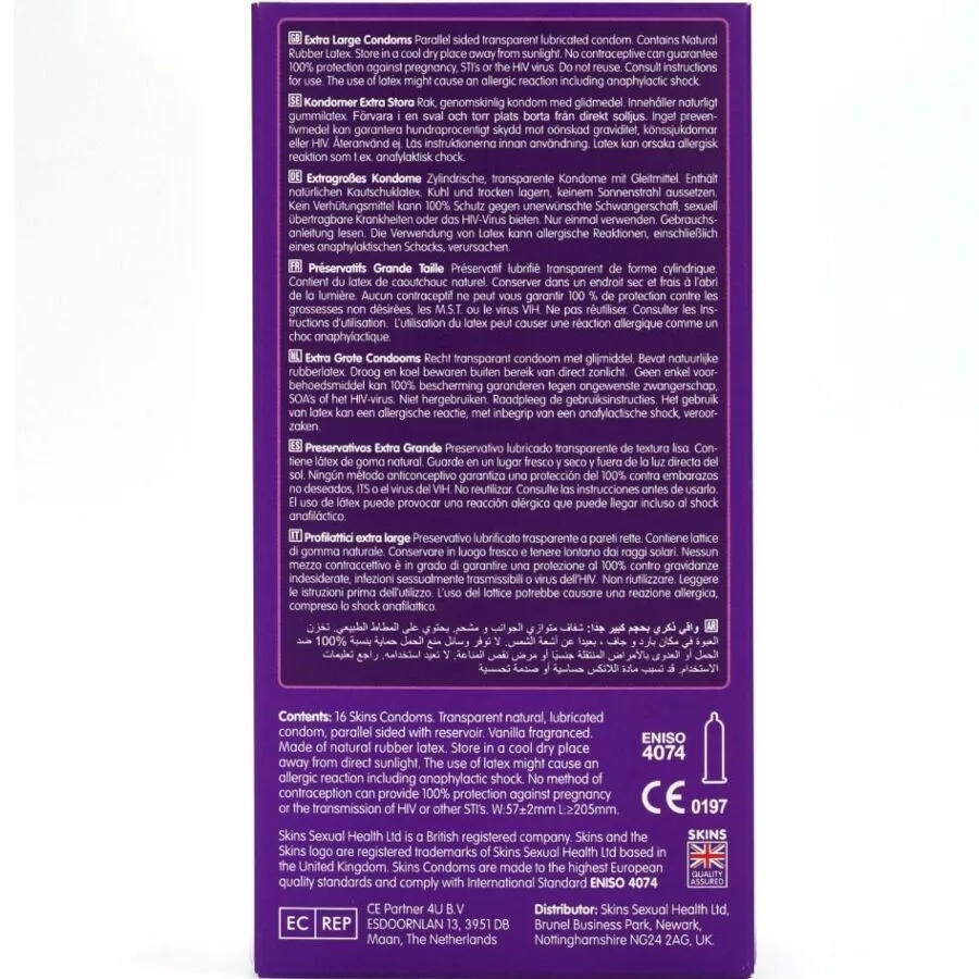 Fedezd fel a luxus biztonságát a SKINS EXTRA LARGE PREMIUM ÓVERRAL! A 16 darabos csomag garantálja a maximális kényelmet és érzéki élvezeteket. Kényeztesd magad és partnered, és élvezzétek a biztonságot egy prémium kaland során! Ne érd be kevesebbel, válaszd a legjobbat!