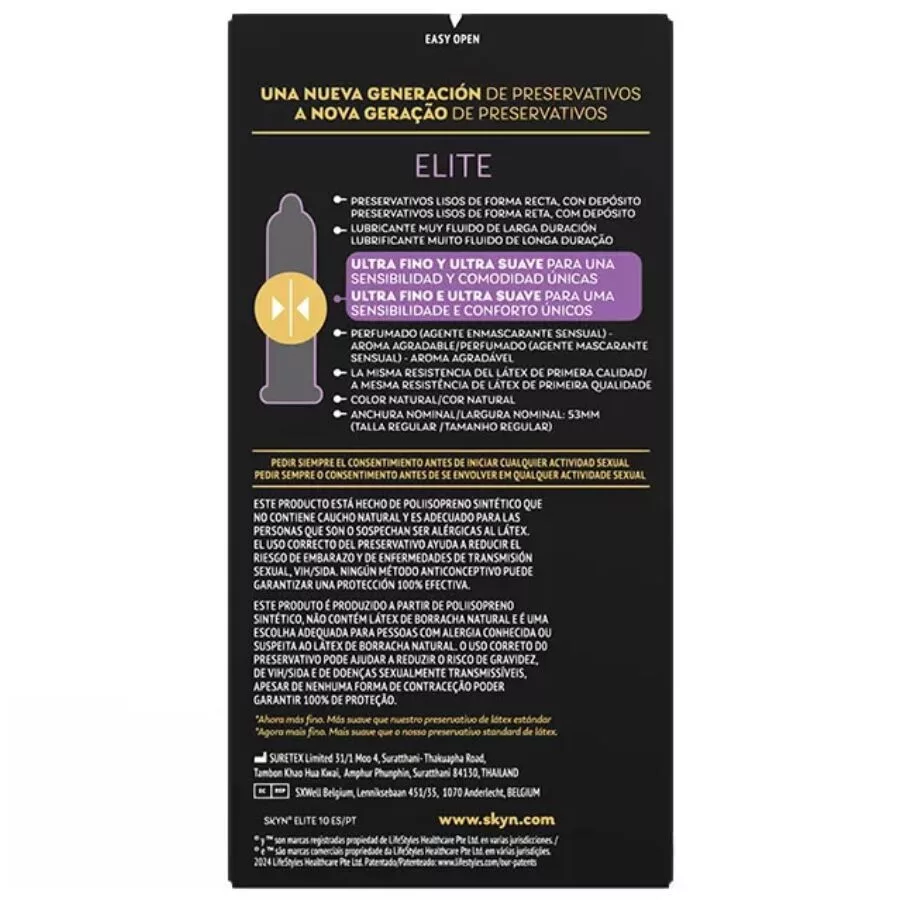 A SKYN, a latex-mentes óvszerek vezető márkája, az innovatív szintetikus latex anyagának köszönhetően egy egyedülálló élményt nyújt. A SKYN ELITE™ nemcsak a kényelem csúcsát jelenti, hanem a hagyományos óvszereket felülmúló élményt kínál, amely mentes a kellemetlen gumiszagtól. Az egyedülálló SKYNFEEL™ technológiának köszönhetően, ezek az óvszerek annyira vékonyak és kényelmesek, hogy szinte észre sem veheted őket, így valóban természetesessé válik az együttlét.
