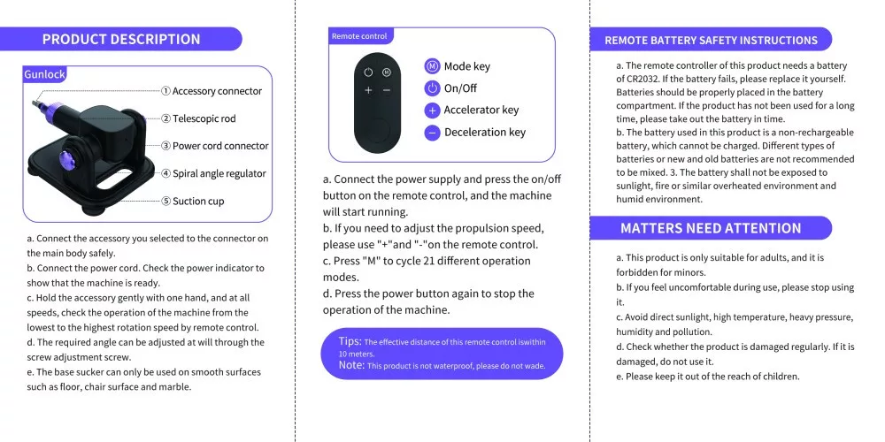 21 különböző rezgési frekvenciával működő, vezeték nélküli távirányítóval szabályozható, adapter segítségével csatlakoztatható szexgép. Tapadókorongja segítségével sík felületen rögzíthető. Részletes összeszerelési útmutató a dobozban található. A távirányító hatótávolsága 10 méter. A termék nem vízálló !